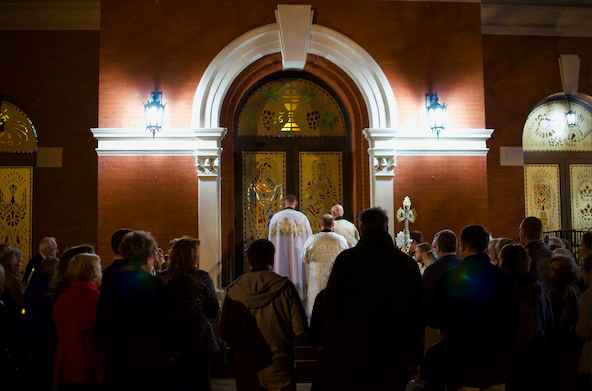 Pascha (Easter): Following the procession around the church, the priest incenses the holy gospel book and the faithful. Holding the handcross in his left hand, the priest signs the doors in the form of a cross with the censer three times, singing: